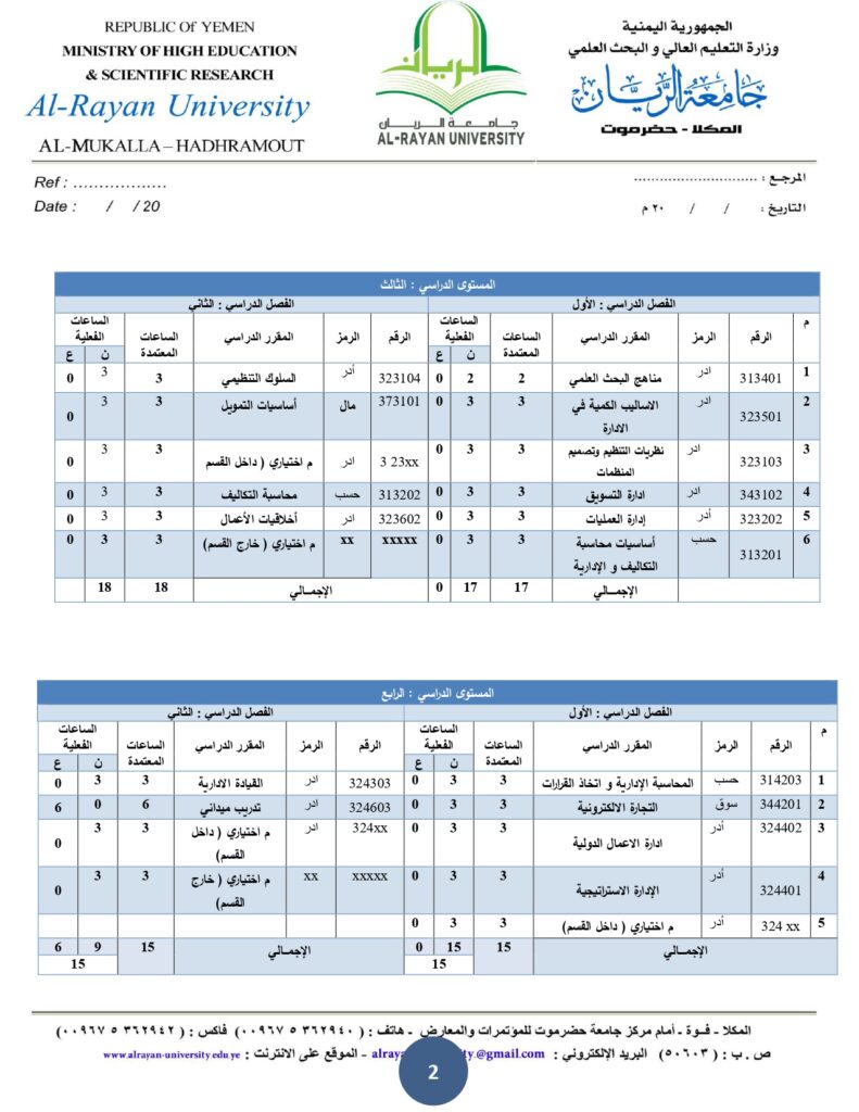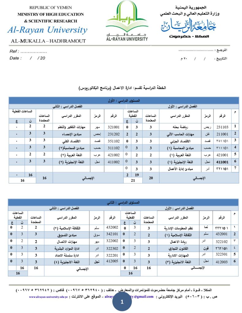 الخطة الدراسية لقسم إدارة الإعمال